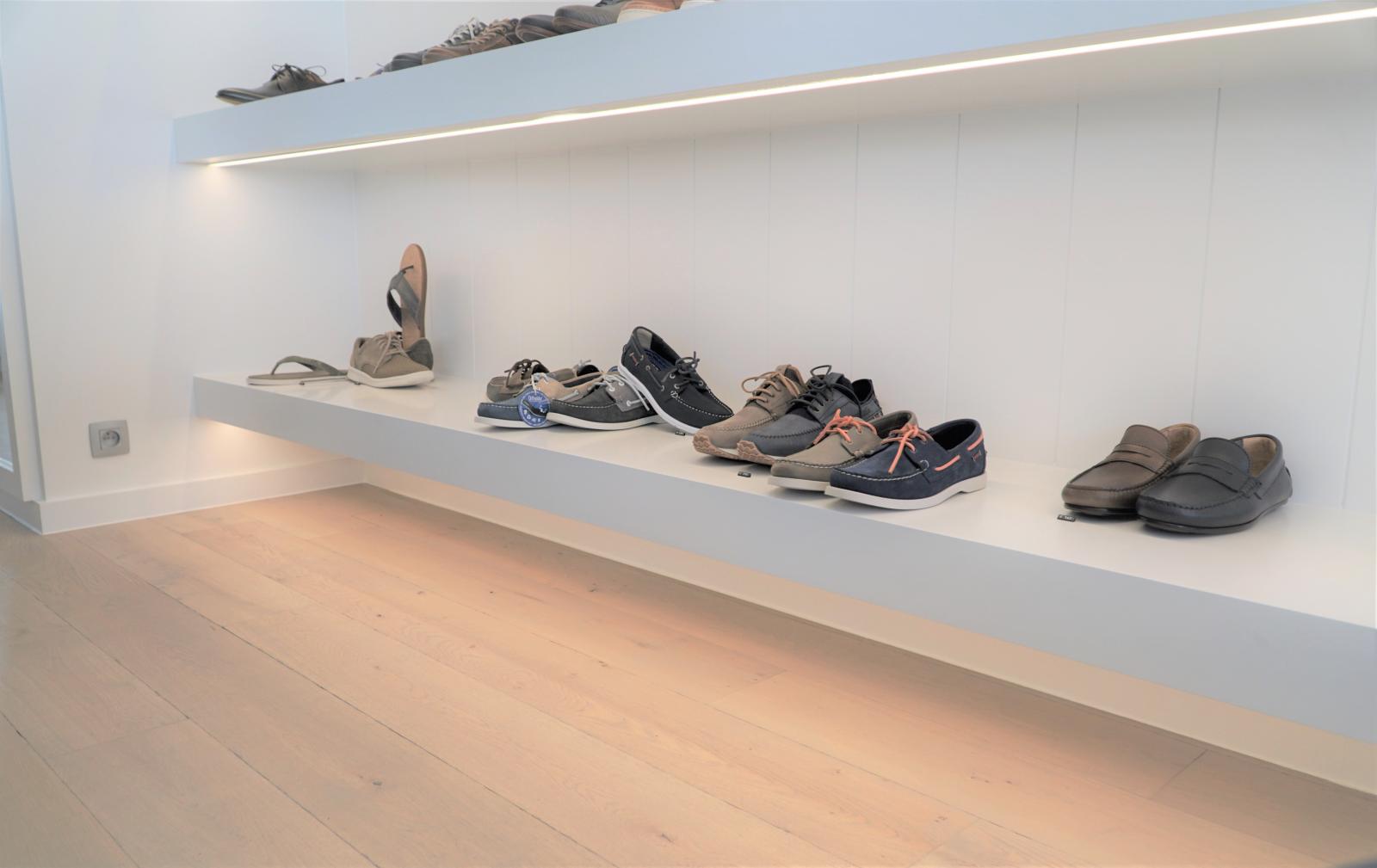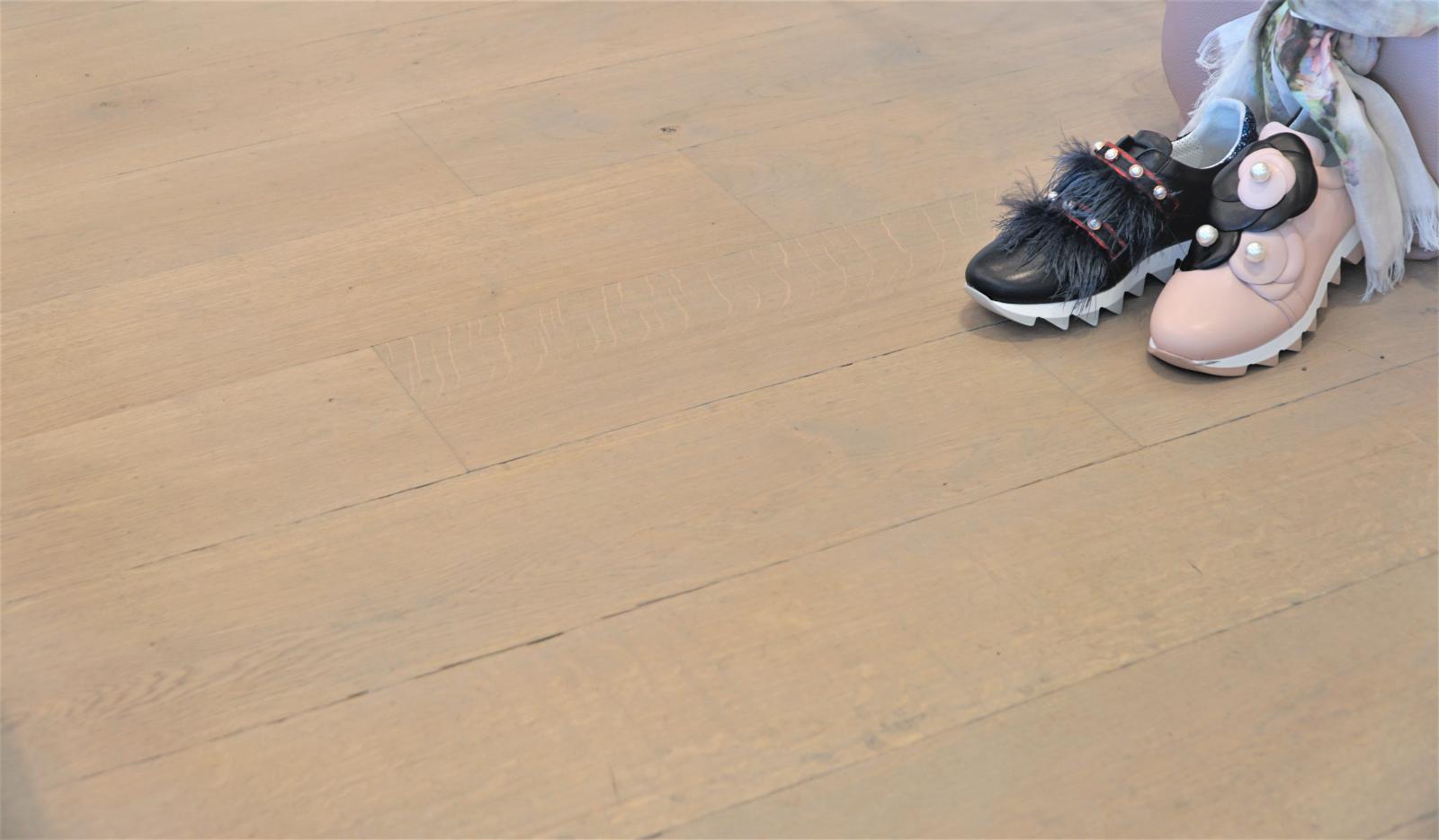 Arcade Shoes & Bags heeft onlangs hun zaak een volledige restyling gegeven met dit prachtig resultaat. Het bestaand parket werd volledig terug opgeschuurd, verouderd en geolied in grijze tint ter plaatse.